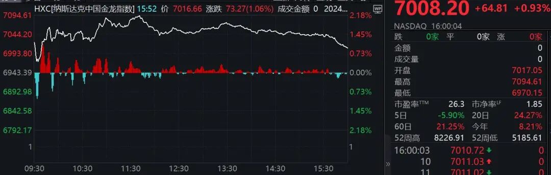 中概股涨跌不一,纳斯达克中国金龙指数涨0.93%。贝壳涨逾4%,爱奇艺涨超2%,百度、哔哩哔哩、京东涨超1%,满帮、阿里巴巴小幅上涨。蔚来、富途控股跌超1%,腾讯音乐、唯品会、小鹏汽车、微博、拼多多、理想汽车小幅下跌。