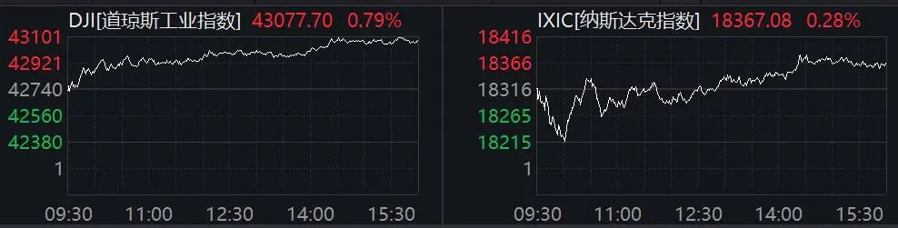 美股三大指数集体收涨,道指涨0.79%,再创历史收盘新高;标普500指数涨0.47%,纳指涨0.28%。