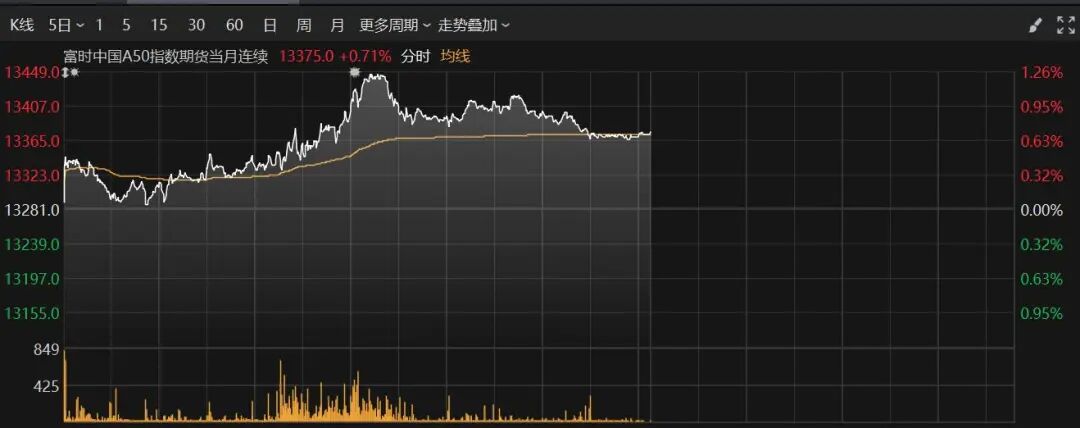 富时中国A50期指连续夜盘收涨0.71%,报13375点。