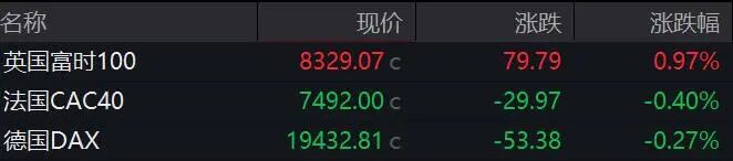 欧洲三大股指多数下跌,英国富时100指数上涨0.97%。